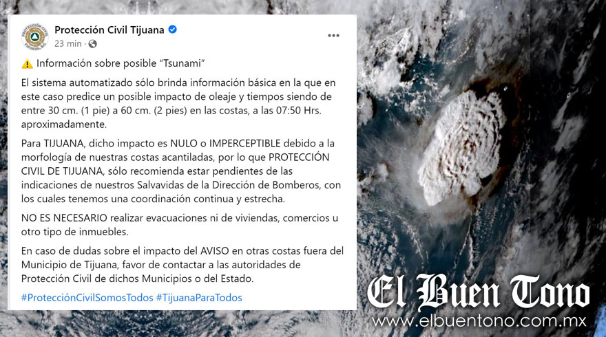 Luego de la erupción de un volcán submarino en la isla de Tonga, se levantó una alerta de tsunami en la costa del Pacífico, que incluye Baja California.