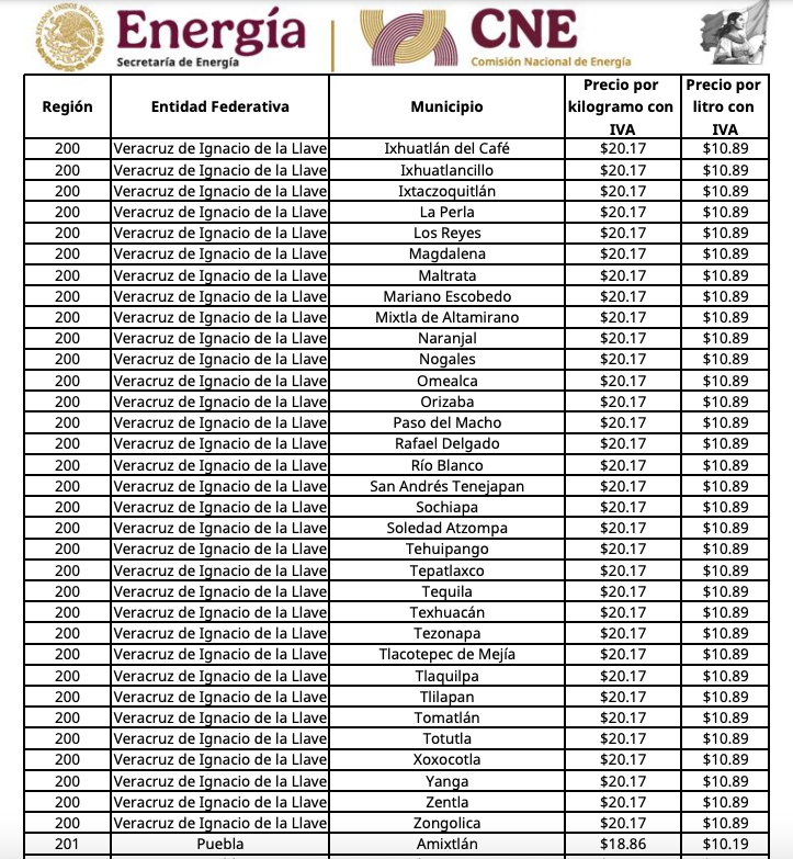 Los precios fueron establecidos por región y también por tipo de venta, ya sea por cilindro o a través de tanque estacionario, por lo que las tarifas pueden variar dependiendo de la zona del país y del proveedor.