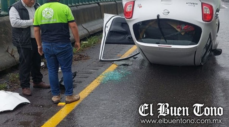 Nogales.- La falta de pericia al conducir y las malas condiciones climatológicas, provocaron que un auto compacto, que circulaba sobre el kilómetro 262 de la autopista Puebla-Córdoba, derrapara y  volcara hasta quedar llantas arriba.