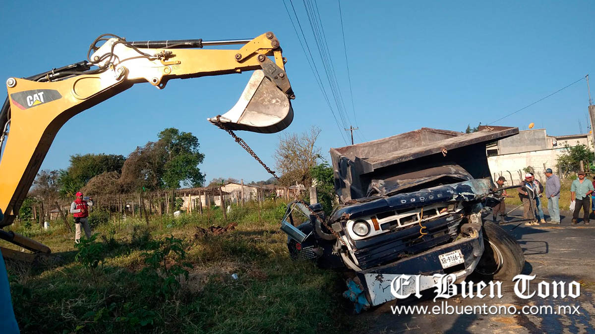 COSCOMATEPEC.- Un operador de un camión de carga quedó prensado, luego que la unidad tipo volteo que conducía presentó una falla en el sistema de frenos, para después estrellarse contra un montículo de tierra, cuando circulaba en la carretera estatal Coscomatepec-Tetelcingo, a la altura de