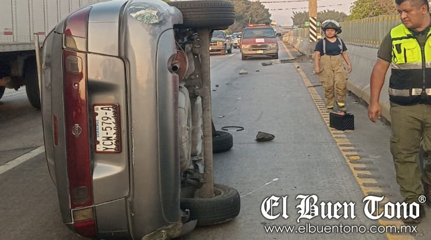 AMATLÁN.- Un automóvil compacto se volcó la tarde de ayer martes en la autopista Córdoba -Veracruz, a la altura del kilómetro 300, debido al exceso de velocidad y la falta de precaución.