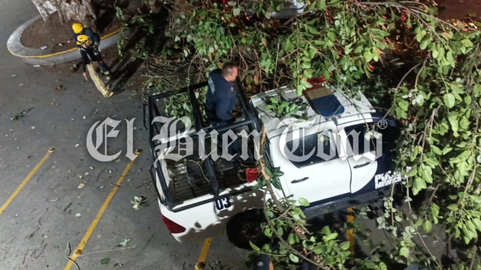 Bomberos regionales y personal de Protección Civil acudieron al apoyo para poder retirar las ramas, que dejó solo daños materiales en la patrulla.