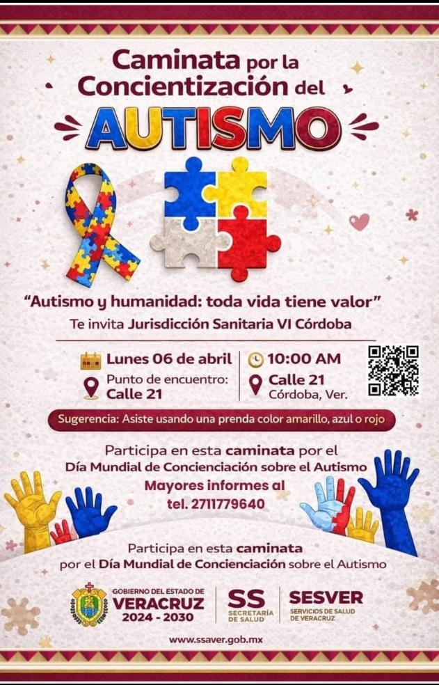 CÓRDOBA, Ver.- La Jurisdicción Sanitaria VI Córdoba convoca a la población a participar en una caminata por el Día Mundial de Concienciación sobre el Autismo, bajo el lema “Autismo y humanidad: toda vida tiene valor”. El evento se llevará a cabo el lunes 6 de abril a las 10:00 horas, con punto de encuentro en la Calle 21 de esta ciudad. Se sugiere a los asistentes usar una prenda amarilla, azul o roja.