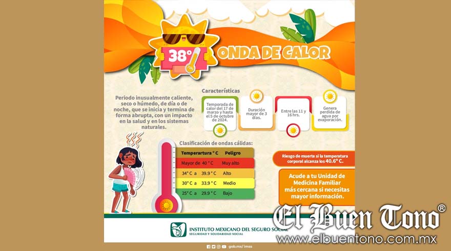 El Instituto Mexicano del Seguro Social (IMSS) en Veracruz Sur comparte recomendaciones para prevenir los efectos adversos del golpe de calor o choque térmico, una condición que puede tener graves repercusiones en la salud al elevar la temperatura corporal y afectar las funciones vitales del cuerpo.
