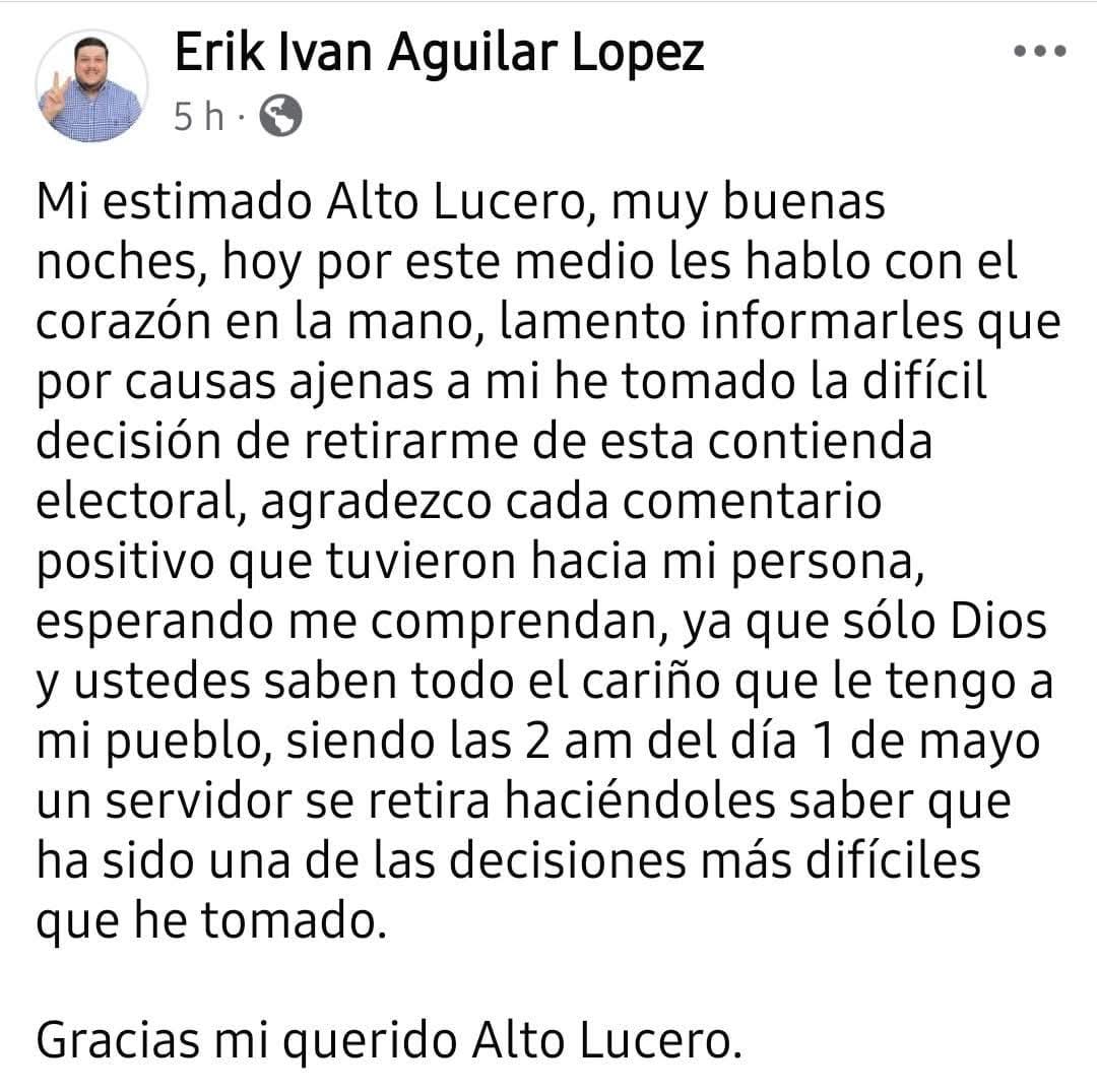 Veracruz._ Erik Iván Aguilar López, quien buscaba la presidencia municipal de Alto Lucero por el PAN, abandonó la contienda electoral en las primeras horas de este 1 de mayo.