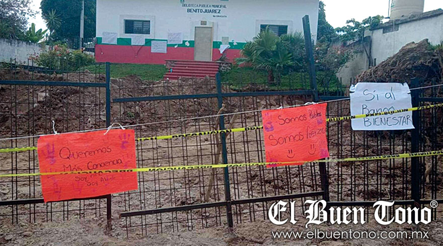 Tlaltetela.- Habitantes del municipio se manifestaron ayer, debido a que están contra la construcción de una sucursal del Banco del Bienestar en el predio que ocupa la biblioteca de la localidad.