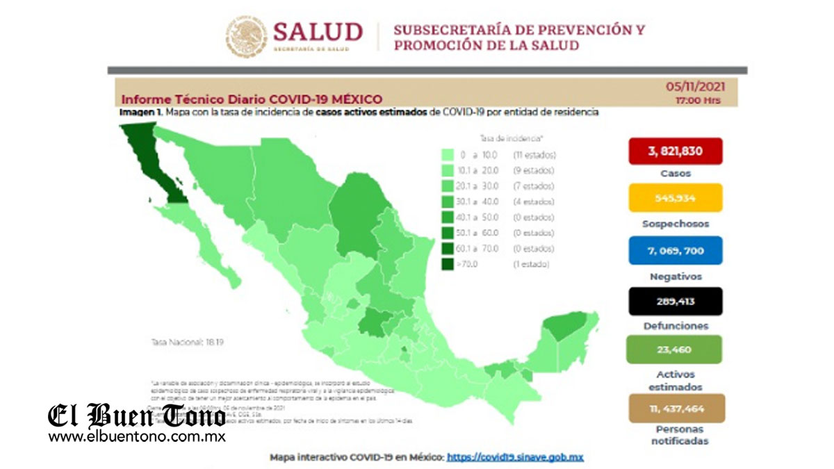 CDMX.- La Secretaría de Salud (SSa) de México reportó este viernes, 282 nuevas muertes por covid para un total de 289 mil 413 defunciones confirmadas, además de otros 3 mil 614 casos para llegar hasta los 3 millones 821 mil 830 contagios detectados.