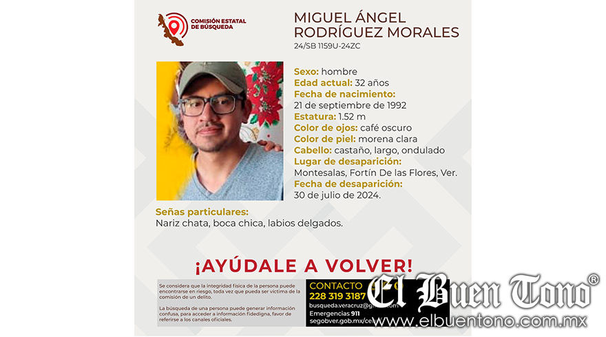 Fortín, Ver.-Un individuo identificado como Miguel Ángel Rodríguez Morales, de 32 años de edad, vecino de la comunidad Monte Salas, esta reportado como desaparecido desde el día de ayer miércoles 30 de julio.