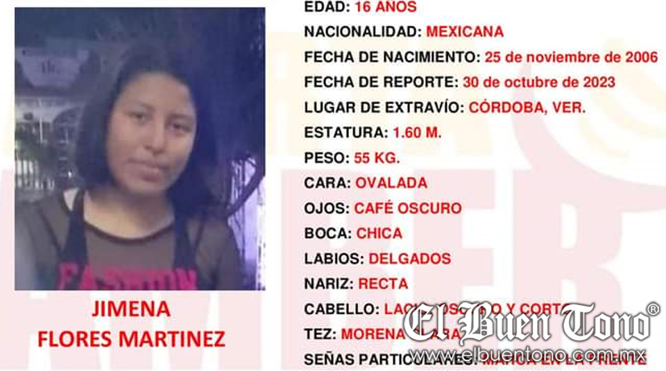 Córdoba, Ver.- Una menor de 16 años de edad, identificada como Jimena Flores Martínez, de 16 años de edad, se encuentra desaparecida desde el día 30 de octubre.