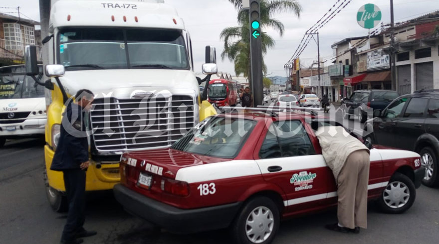 Córdoba.- El conductor del taxi número 183 del sitio Premier de Fortín, fue el presunto responsable de ocasionar un choque ya que al realizar un corte de circulación fue impactado por un Tractocamión de la empresa Trabel, quedando ambas unidades afectando la circulación hasta el arribo de las autoridades de Tránsito Municipal.