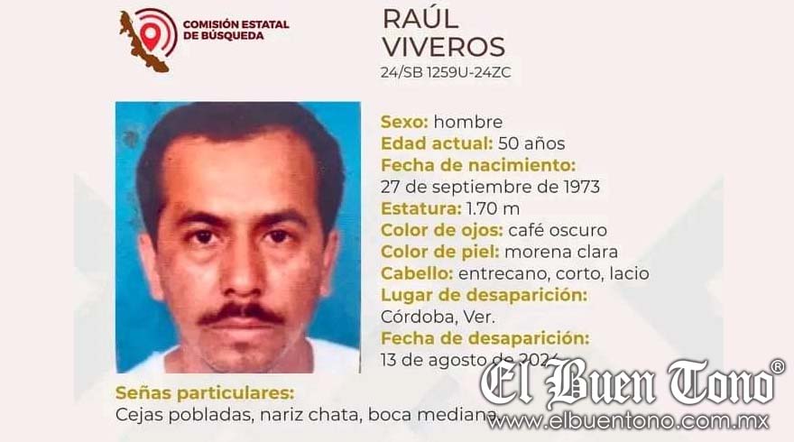 Córdoba, Ver.- Un hombre identificado como Raúl Viveros, de 50 años de edad, está reportado como desaparecido desde el pasado 13 de agosto.