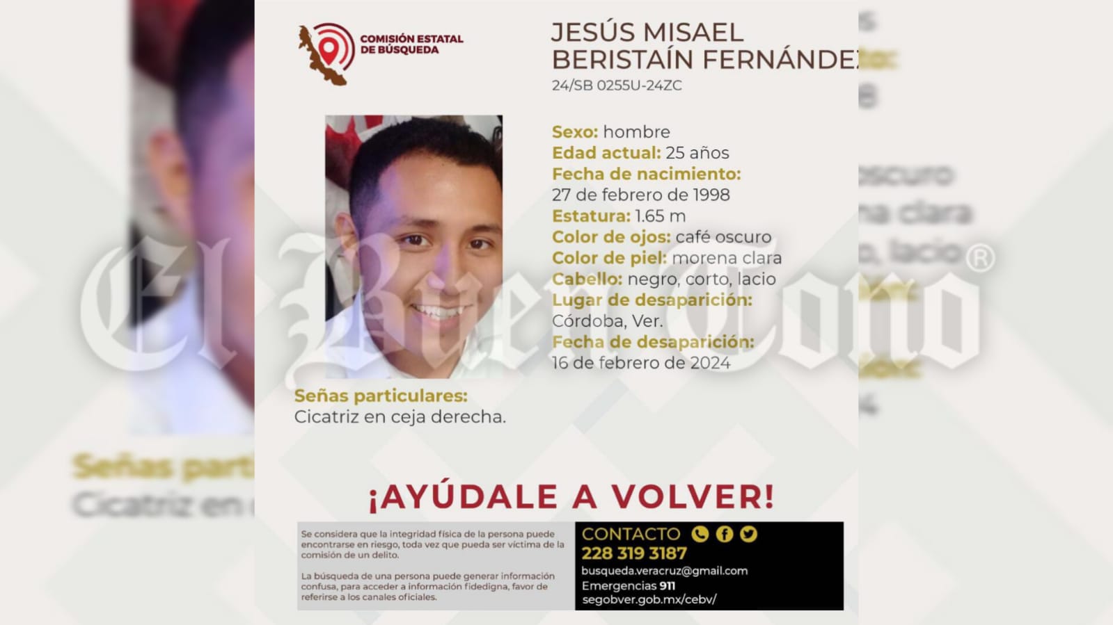 Córdoba, Ver.- Un joven de 25 años de edad, identificado como Jesús Misael Beristain, vecino de esta ciudad, esta reportado como desaparecido desde el día de ayer 16 de febrero. Su familia, pide el apoyo de las autoridades policiacas y de la ciudadanía en general para localizarlo sano y salvo ya que podría ser víctima de algún delito.