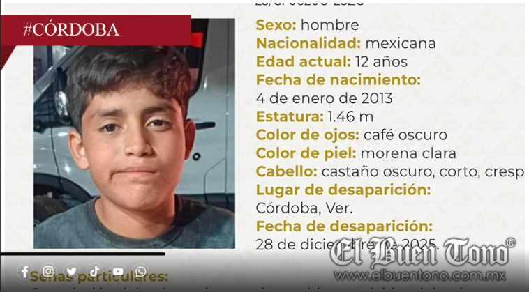 Córdoba, Ver. — Jose Manuel Rivera Hernández, de 12 años, fue reportado como desaparecido desde este 28 de diciembre, informó su familia. Los familiares solicitan el apoyo de las autoridades y de la ciudadanía para dar con su paradero y que sea localizado sano y salvo.