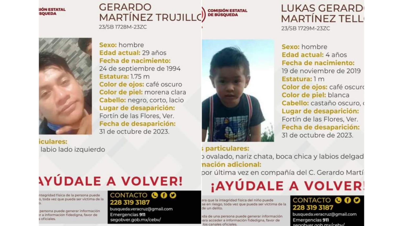 Fortín, Veracruz. – Un joven identificado como Gerardo Martínez Trujillo, de 29 años de edad, y su hijo de 4 años, Lukas Gerardo Martínez Tello, vecinos del Pueblo de las Flores, se encuentran desaparecidos desde el día de ayer, martes 31 de octubre, tras salir a bordo de un automóvil Volkswagen Jetta, con placas de circulación YJH2633. Familiares solicitan la ayuda de las autoridades policiales para localizarlos sanos y salvos, y también la colaboración de la ciudadanía en general. La Comisión Estatal de Búsqueda de Personas Desaparecidas ha emitido una alerta a las diferentes corporaciones policiales del Estado.