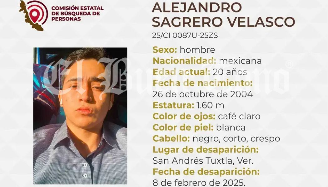 San Andrés Tuxtla, Ver.- La Comisión Estatal de Búsqueda de Veracruz emitió una alerta por la desaparición de Alejandro Sagrero Velasco, un joven de 20 años cuyo paradero se desconoce desde hace varios días en el municipio de San Andrés Tuxtla, al sur del estado.