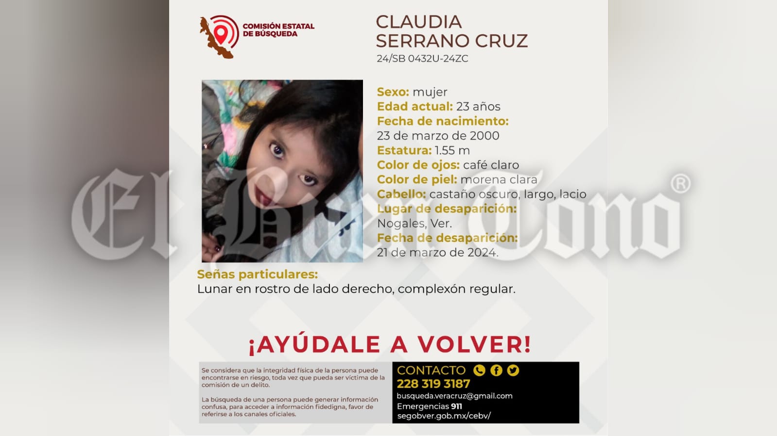 Se trata de una joven de 23 años, de nombre Claudia Serrano Cruz quién desde la tarde del jueves 21 de marzo, no tienen informes de su paradero.