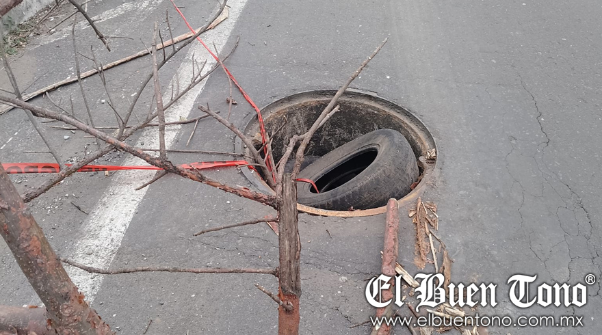Córdoba.- Automovilistas en la zona limítrofe entre Córdoba y Fortín denunciaron el robo de una alcantarilla cerca de la calle Garza Sada. Alertan sobre el grave riesgo para quienes transitan por la zona, ya que el registro ausente solo está cubierto por dos llantas y una rama.