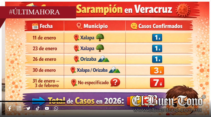 Los contagios de este año en Veracruz representan los primeros del brote, después de que en 2025 no se registraran casos confirmados, cerrando ese año con 261 probables. El sarampión es altamente contagioso, transmitiéndose por gotas de saliva al toser o estornudar, y puede provocar complicaciones graves en niños y personas con defensas bajas. Sus síntomas incluyen fiebre, congestión nasal, ojos irritados, manchas en la boca y erupciones en la piel.