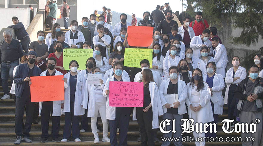 Con pancartas, los inconformes expusieron que piden “horarios respetados, insumos necesarios”, “no somos delincuentes, exigimos espacios dignos para trabajar”, “insumos necesarios, derechos básicos para médicos residentes”, “no más acoso laboral”, entre otras leyendas que mostraron.