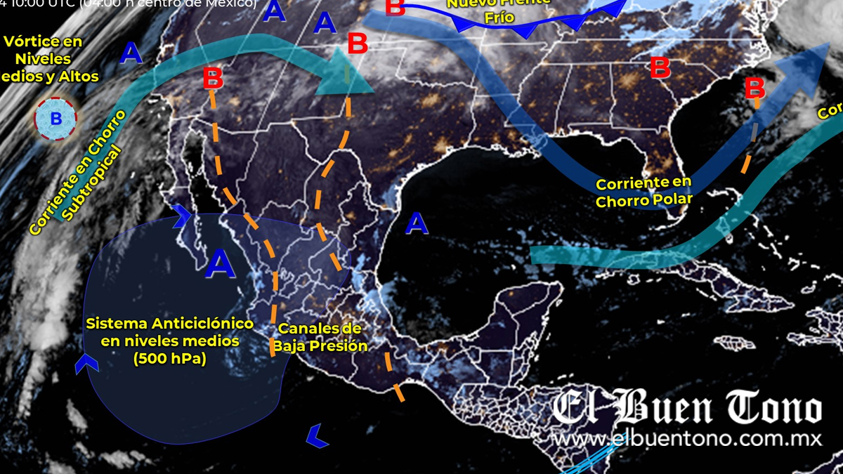 Para hoy,canales de baja presión y la entrada de humedad de ambos litorales, originarán chubascos vespertinos acompañados de descargas eléctricas sobre entidades del occidente, sur y sureste del país, con posibles granizadas en Jalisco, Michoacán, Guerrero y Oaxaca. Un sistema anticiclónico en niveles medios de la atmósfera mantendrá tiempo estable y baja probabilidad de lluvia sobre el noroeste, norte y noreste del territorio nacional. Se pronostican rachas de viento de componente norte de 50 a 60 km/h en el Istmo y Golfo de Tehuantepec, disminuyendo en el transcurso de esta mañana; y por la tarde, vientos de componente sur (“Surada”) con rachas de 50 a 60 km/h en el litoral de Tamaulipas y Veracruz. Por otra parte, el nuevo frente frío (núm. 22) y su masa de aire polar, ingresarán en el norte de México durante la noche de hoy y producirán marcado descenso de temperatura con rachas de viento fuertes a intensas sobre entidades del norte y noreste de la República Mexicana, acompañadas de tolvaneras en zonas de Coahuila, Nuevo León y Tamaulipas.