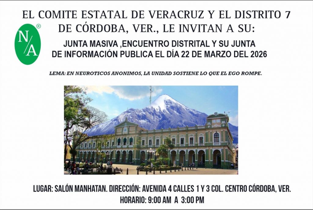 Córdoba, Ver.- El próximo 22 de marzo de 2026, el Comité Estatal de Veracruz y el Distrito 7 de Neuróticos Anónimos llevarán a cabo una Junta Masiva, Encuentro Distrital y Junta de Información Pública en el Salón Manhattan de Córdoba. Se espera la asistencia de aproximadamente 100 personas, entre delegados, coordinadores y miembros de grupos de autoayuda provenientes de diversas regiones del estado y del país.