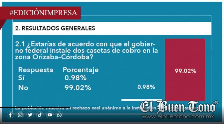 Región.- Una abrumadora mayoría del 99.02% de los ciudadanos en la Zona de las Altas Montañas se manifestó en contra de la posible reinstalación de casetas de cobro en el corredor Orizaba-Córdoba, según los resultados de una encuesta ciudadana aplicada por la Cámara Nacional de la Industria de Transformación (Canacintra) Córdoba.