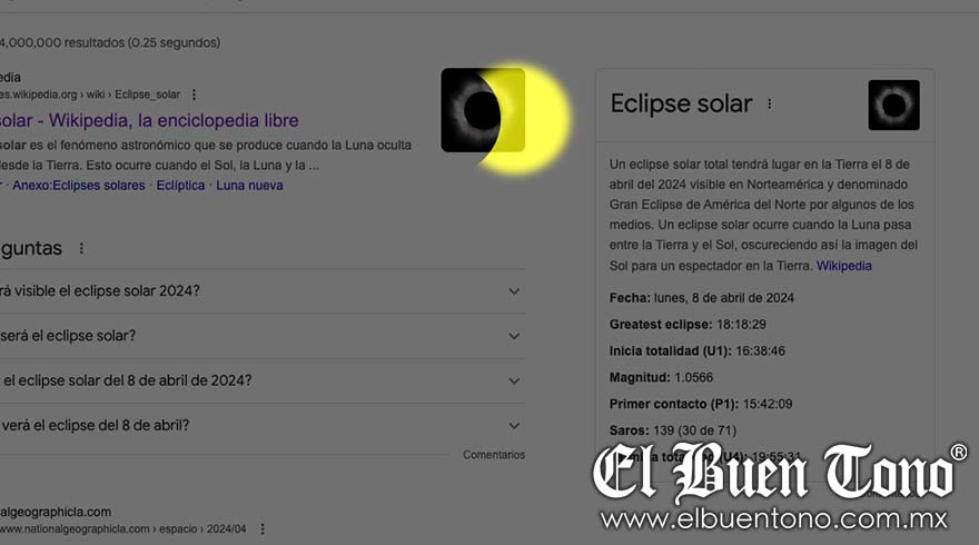 Cuando los usuarios escriben “eclipse solar” en la barra de búsqueda de Google, se encuentran con una sorpresa: una animación que oscurece la pantalla y muestra el eclipse de principio a fin. Esta característica está diseñada para dar a los usuarios una vista previa interactiva y educativa del evento.