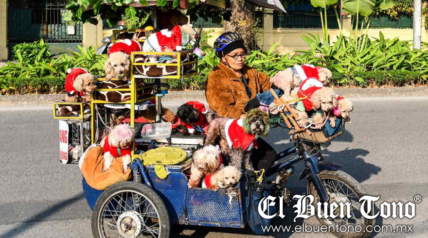 Vietnam.- Una peluquera jubilada Nguyen Thi Kim Quy transita por las bulliciosas calles de Hanói con un colorido tuktuk cargado con 13 perros callejeros con indumentarias navideñas para concienciar contra el consumo de carne canina en Vietnam.