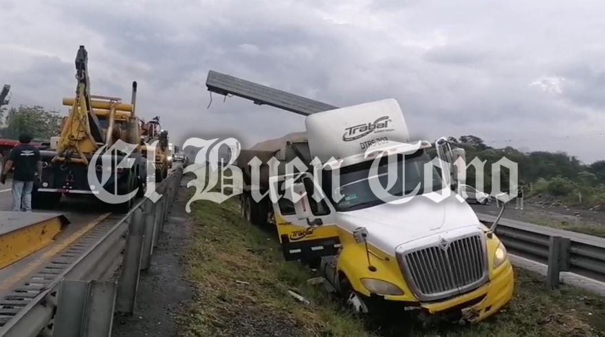 Se supo que la mañana de este jueves un tractocamión marca International, color blanco con amarillo, acoplada con una plataforma que transportaba material para construcción, con razón social “Trabal”, sufrió una falla en el sistema de frenos, chocó contra el muro de contención derribando un letrero de Capufe.