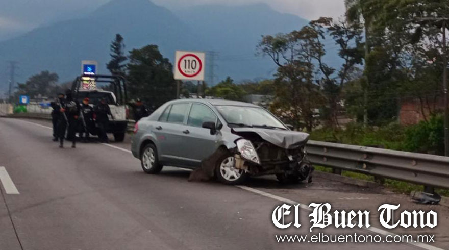 Ixtaczoquitlán.- El exceso de velocidad y la falta de pericia por parte de su conductor, provocaron que el vehículo en el que viajaba una familia sobre la autopista Puebla-Córdoba, derrapara y chocara contra la barra de contención metálica que está a la altura del kilómetro 275.