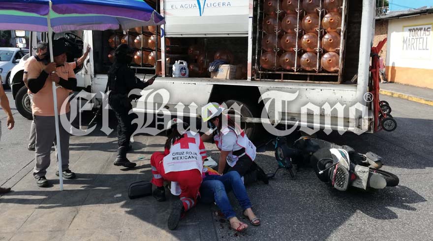 Córdoba. – Una mamá y su hijo que viajaban en una motoneta resultaron lesionados al chocar contra un camión repartidor de agua, el cual se les cruzó al circular sobre el bulevar San Francisco y la calle Santa Rita del infonavit San Román. Paramédicos de la Cruz Roja les brindaron los primeros auxilios y la mujer fue trasladada a un hospital por una posible fractura en el brazo izquierdo, mientras que su hijo quedó bajo el cuidado de su papá. Agentes de Tránsito municipal intervinieron para deslindar responsabilidades y retirar los vehículos involucrados.