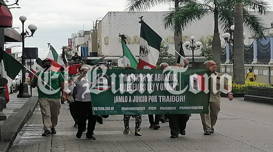 Córdoba. – Un grupo de reducido de ciudadanos del grupo “FRENA” se dieron cita en el parque 21 de mayo, con lonas en mano que decían “Basta de abrazos, queremos ley y orden”, “AMLO a juicio por traidor” entre otras.