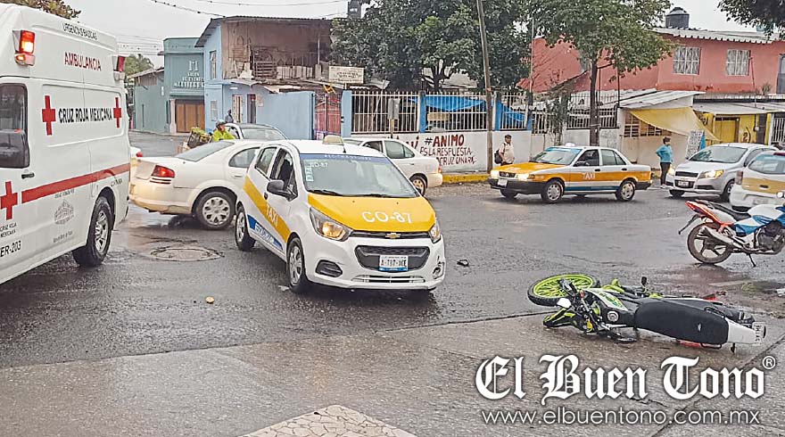 La falta de precaución por parte del motociclista, quien intentó rebasar el tráfico, terminó en una colisión con el taxi número CO-87, el cual salió de la calle 14 para cruzar la avenida 10.