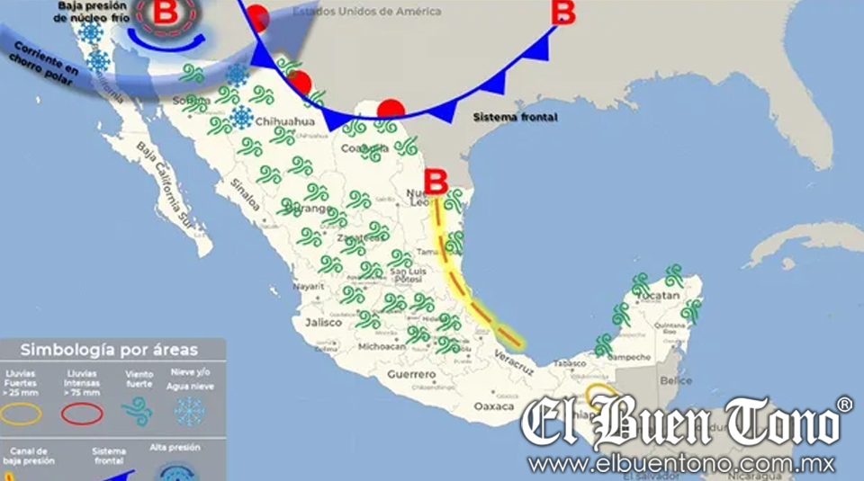 Los primeros efectos del sistema frontal se sentirán en el noroeste y norte del país con descensos en las temperaturas, fuertes ráfagas de viento y lluvias. Además, se pronostica la probabilidad de caída de nieve o aguanieve en las sierras de Baja California.