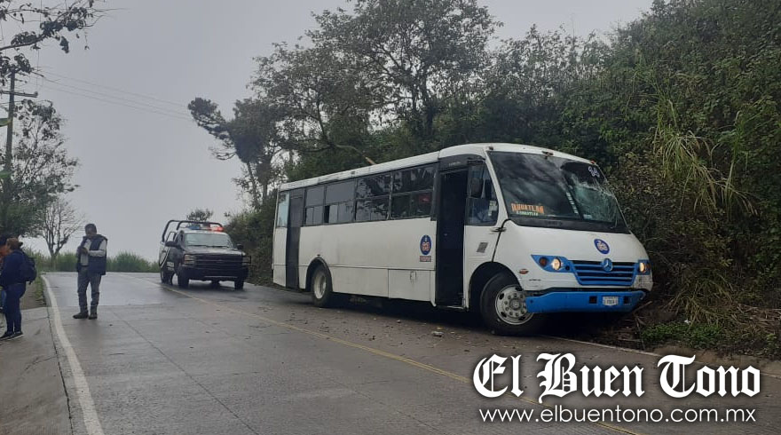 Tomatlán.- Un autobús de pasajeros, con número 14, chocó contra un cerro durante la mañana de ayer, luego de que el chofer, Carlos Hernández Rodríguez, de 46 años, perdió el control y derrapó al momento de circular sobre la carretera Ixhuatlán del Café-Tomatlán, a la altura del lugar conocido como Las Compras. Tras el choque, al lugar arribó personal de Protección Civil, así como de la Policía Municipal, quienes auxiliaron al chofer y pasajeros, los cuales afortunadamente resultaron ilesos.
