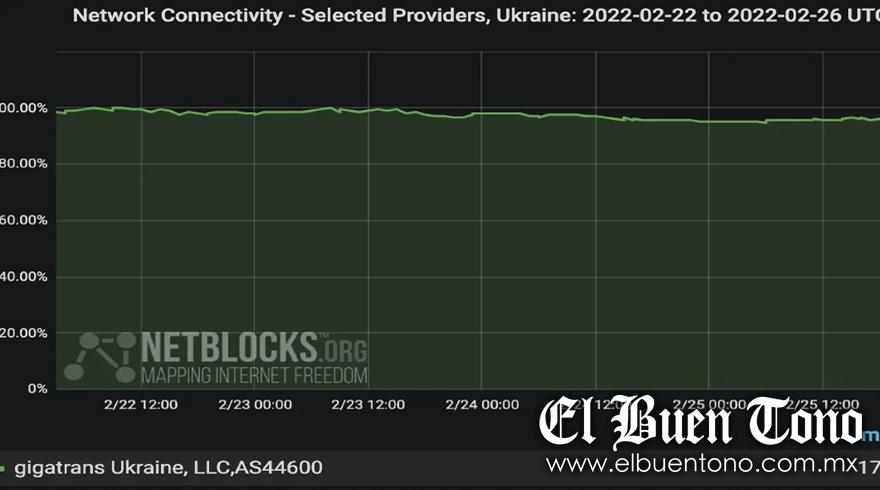 La conectividad de GigaTrans, el principal proveedor de Internet de Ucrania, cayó por debajo del 20 por ciento de los niveles normales antes de volver a niveles más altos en la madrugada de ayer viernes, según el observatorio de bloqueos de Internet NetBlocks.