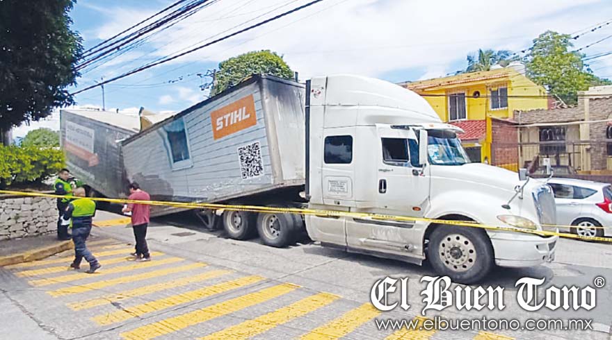CÓRDOBA.- La caja de un tractocamión con razón social Stihl que llevaba llantas, se partió en la calle 9 y avenida 33 de la colonia Brillante Crucero.