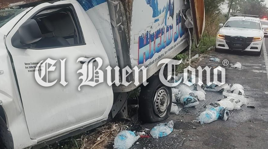 Cuitláhuac, Ver – Una camioneta Nissan tipo caja, que transportaba hielo, se volcó durante la mañana de este jueves a la altura del kilómetro 55 de la carretera federal Cuitláhuac-La Tinaja, luego de que se le reventara un neumático.