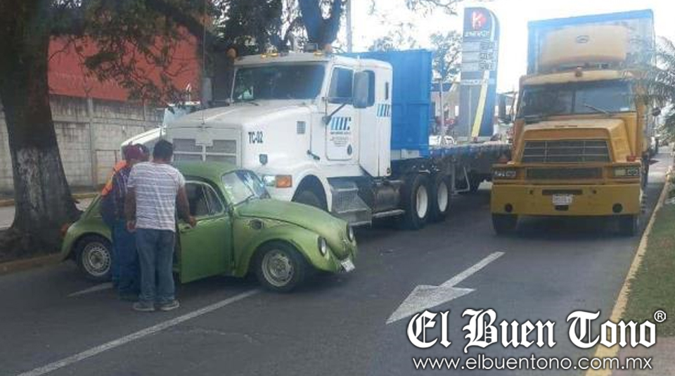 Ixtaczoquitlán.- Tres personas que viajaban en un auto quedaron impresionadas, luego de que el vehículo fue impactado y arrastrado por un tráiler sobre el bulevar Fernando Gutiérrez Barrios, a la altura de la cabecera municipal