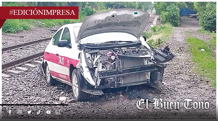 AMATLÁN.- El taxi número 90 de la comunidad Paraje Nuevo, resultó seriamente dañado al ser impactado por un tren carguero, la mañana de este martes en el cruce ferroviario.