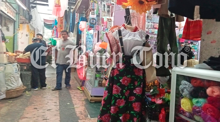 En los locales del Mercado Revolución ya se venden trajes de manta, carrilleras, faldas, blusas y trenzas para las próximas fiestas patrias.