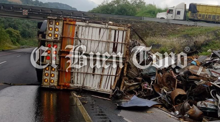 Maltrata.- El choque de dos tráileres y la volcadura de uno de ellos se registró el día de hoy en el kilómetro 234 de la autopista Puebla-Córdoba, luego de que uno de ellos se quedó sin frenos y provocó la colisión.
