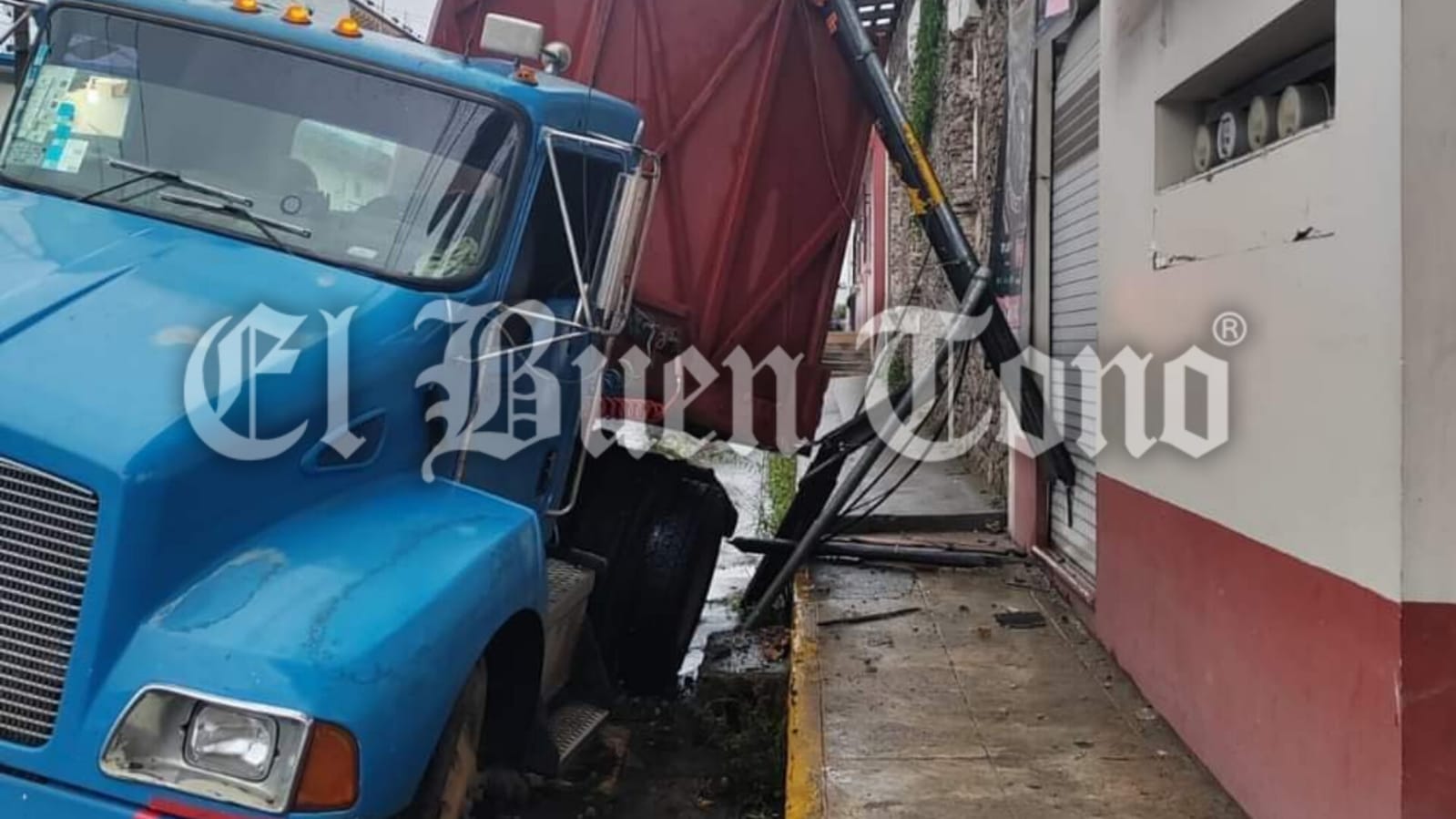 Coscomatepec. – Un tráiler tipo plataforma causó daños en un poste de telefonía, al quedarse sin frenos cuando bajaba sobre la avenida Guadalupe Victoria, para incorporarse a la carretera federal Fortín-Huatusco.