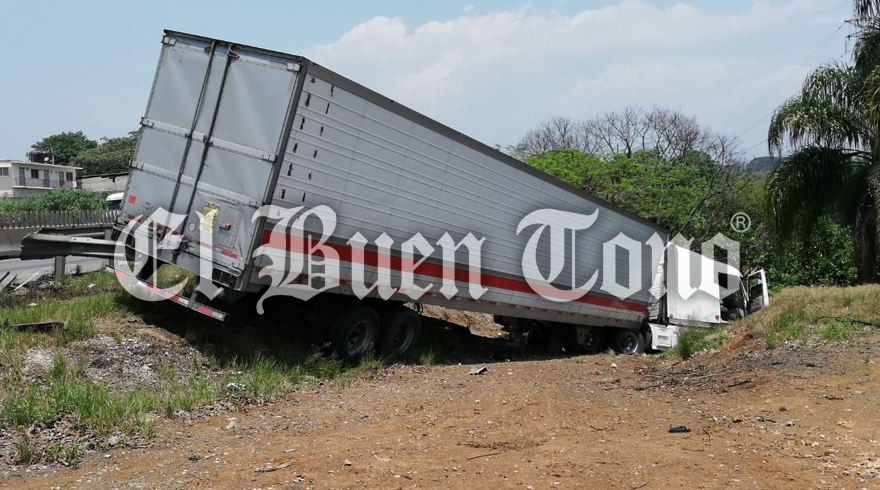 Córdoba.- Un tráiler cargado de plátanos terminó incrustado en un camino de terracería, al salirse de la autopista Córdoba-Veracruz, a la altura de Tranca de Tubos, luego de sufrir una falla mecánica.