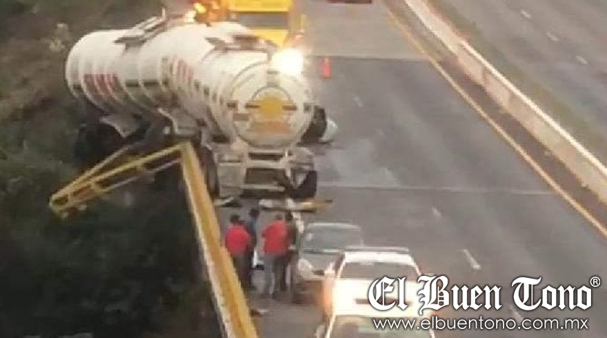 Cuitláhuac.- Un tractocamión acoplado a dos pipas, estuvo a punto de caer de un puente de la autopista Córdoba-Veracruz, cerca de la caseta de peaje de Cuitláhuac.