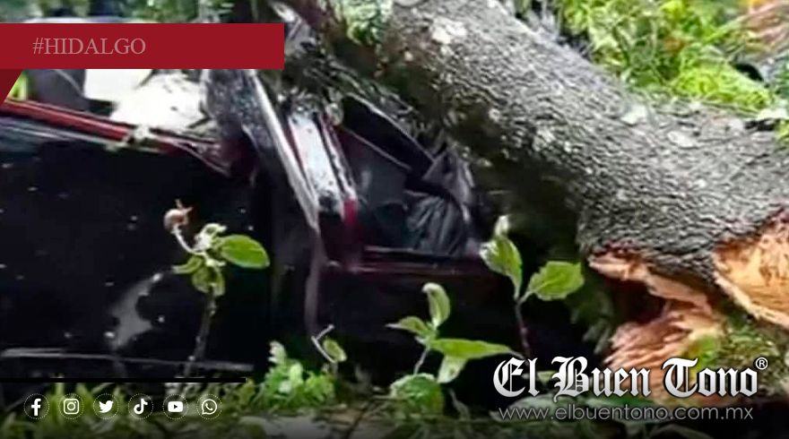 Hidalgo.– La fuerte lluvia registrada en la región provocó que un árbol de encino cayera sobre una camioneta que transitaba por la carretera federal México–Tuxpan, a la altura del tramo Acaxochitlán–Venta Quemada, cerca del Bosque de los Duendes.