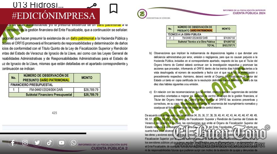 La auditoría de la Cuenta Pública 2024 practicada por el Órgano de Fiscalización Superior del Estado de Veracruz ha revelado un presunto daño patrimonial a la Hacienda Pública en Hidrosistema de Córdoba.