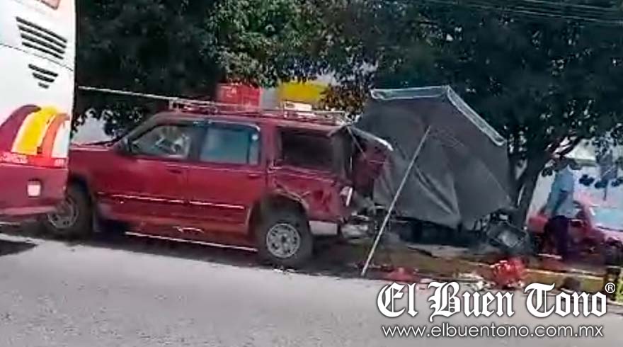 Presuntamente el conductor del camión de pasaje se distrajo, se salió un poco de la vialidad y chocó contra la camioneta que fungía como un puesto.