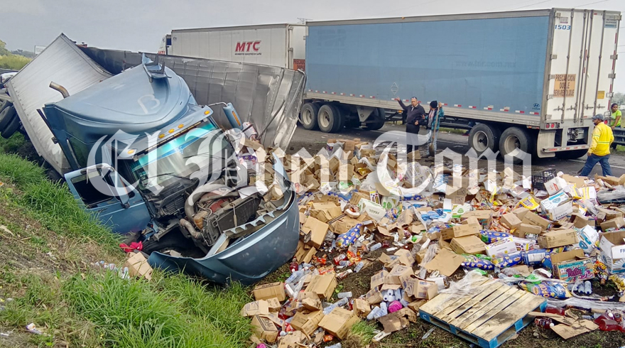 Fortín, Ver.- Un tractocamión terminó volcado la mañana de este martes, presentando serios daños materiales y con toda la mercancía que transportaba regada en la cuneta que divide ambos cables de circulación, en la autopista Veracruz- México debido a que operador quién logró salir ileso, perdió el control en un tramo de curva presuntamente por exceso de velocidad cerca del km 287, lo que generó la movilización de los grupos de auxilio elementos de la Guardia Nacional además de afectar la circulación la cual permanece cerrada en estos momentos.