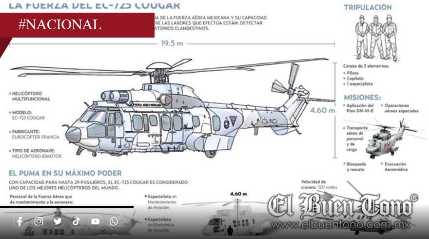 El gobierno federal ha sumado seis helicópteros EC-725 tipo Cougar a la Comandancia de la Fuerza Aérea Mexicana, destinados a operaciones de alto impacto contra la delincuencia organizada y al apoyo ciudadano. La adquisición, mediante arrendamiento financiero, tuvo un costo de 286.4 millones de pesos, según información proporcionada por la Secretaría de la Defensa Nacional (Sedena).